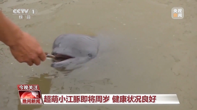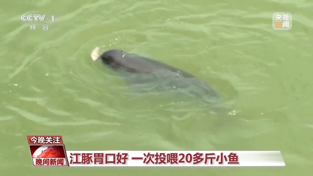 总台记者 江凯:每次快到了开饭时间,江豚就提前几分钟游了过来,不时翻出水面,好像在催着开饭。这一桶鱼大概是25斤,由于江豚吃不了太大的鱼,所以喂养的半斤以下的小鱼。