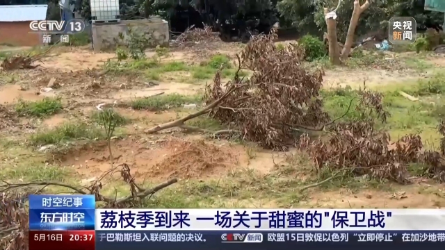 廖美敬所处的这个荔枝果园,面积超过了600亩,虽然这些果树还在坐果期,但光是凭这些稀疏的枝条,大量被雨水、冰雹打落在地的残枝枯叶,就能让人提前推断出今年荔枝收成的情况。按廖美敬的说法,预计今年这里的产量要比去年减少6成。