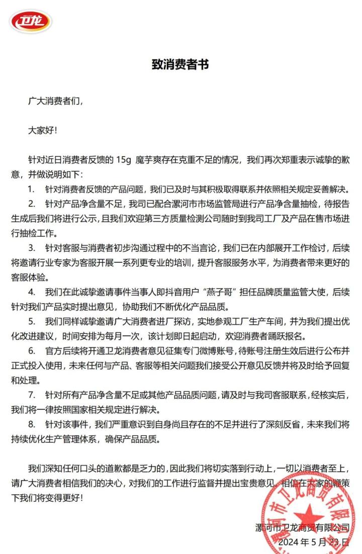 同日17:01,卫龙官方在微博发布《致消费者书》,并再次道歉。