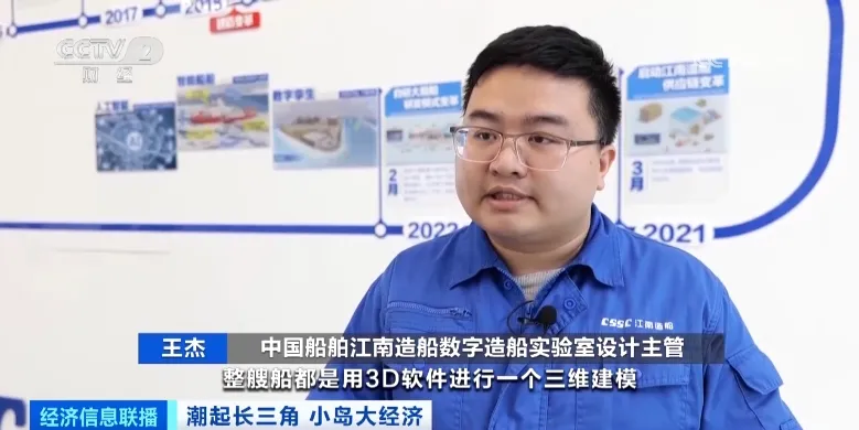 中国船舶江南造船数字造船实验室设计主管 王杰:整艘船都是用3D软件进行三维建模,基于这个来进行测量、交互,大大减少了我们的废返率。