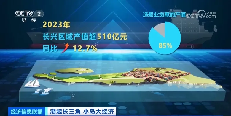 如今,在长兴岛上,从研发攻关到关键部件生产再到下游建造,造船需要什么,在这里基本都可以找到,技术、人才、设备一应俱全。长兴海装特色园区,已经吸引四大央企和超过70家船配企业入驻,超过7000家公司注册,2023年,长兴区域产值超过510亿元,同比增长12.7%,其中造船业贡献的产值近85%。