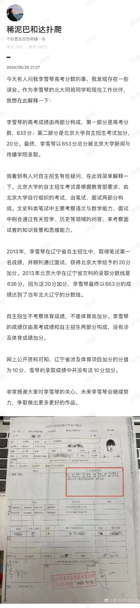 6月26日,一位李雪琴的北大同班同学@稀泥巴和达扑爬晒出入学成绩单为她发声,称李雪琴高考成绩中的20分自主招生考试加分和体育特长无关。