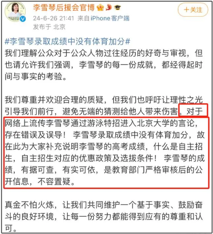 6月26日晚,@李雪琴后援会官博 也发文强调李雪琴录取成绩中没有体育加分,“李雪琴的成绩,有据可查,有实可依,是教育部门严格审核后的公开信息,不容置疑。”