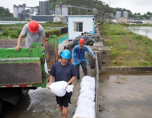 为应对台风“普拉桑”,9月19日,工作人员在浙江省台州市三门县健跳镇渔港码头加固堤坝。新华社记者 翁忻旸 摄