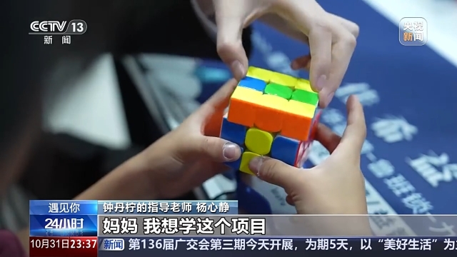 钟丹柠的指导老师 杨心静:她看到我在玩魔方,还有其他益智项目,很有兴趣。她主动跟妈妈提出,妈妈我想学这个项目。她妈妈感到很惊讶,她第一次主动提,以往都是家里安排。这一次她自己要求,家里就支持她这个想法,一直坚持下来。