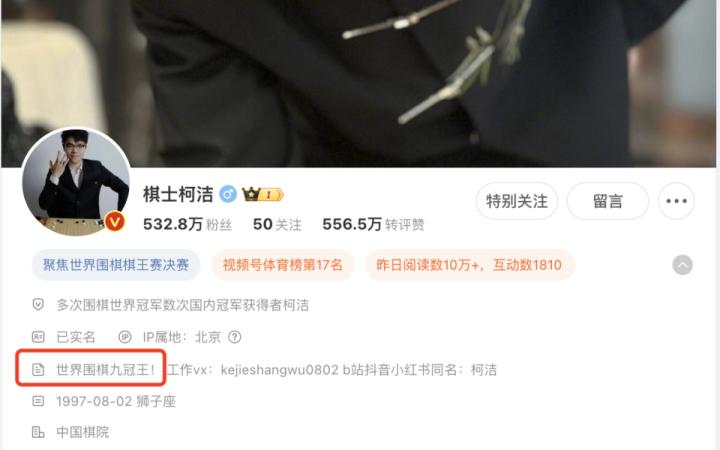 柯洁社交平台简介改为“世界围棋九冠王”