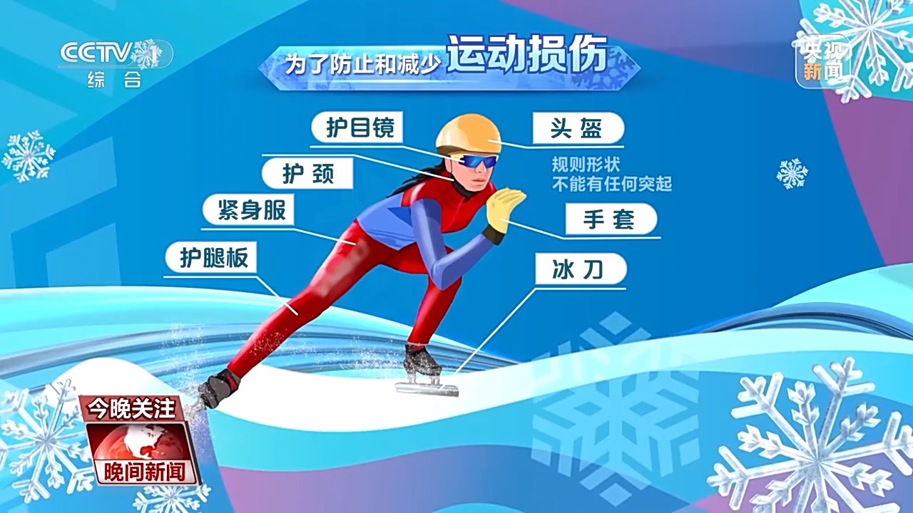 为了防止和减少运动损伤,运动员头盔必须是规则形状,不能有任何突起,还可以选择佩戴护目镜,护颈、手套、紧身服、护腿板都要有防切割功能,冰刀刀根为圆弧形,刀管采用封闭式,最少有两点固定在鞋上,没有可动部分。