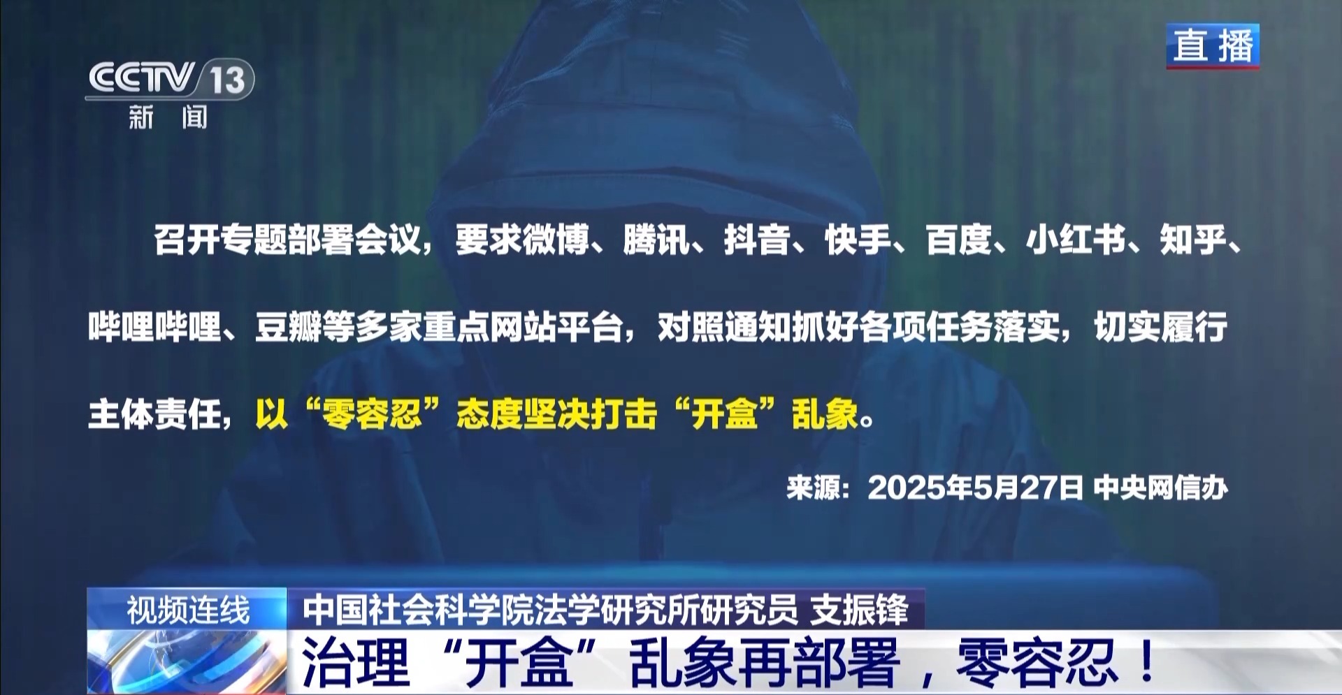 5月27日,中央网信办对外公布对“开盒”乱象的进一步部署整治,从阻断“开盒”信息传播、完善预警机制、加大惩治力度、优化保护措施等方面明确工作要求,以零容忍态度坚决打击开盒乱象。“零容忍”的态度背后,进一步整治的具体方向和措施都有哪些?平台、法律该如何进一步发挥作用?《新闻1+1》连线中国社会科学院法学研究所研究员支振锋,带来分析解读。