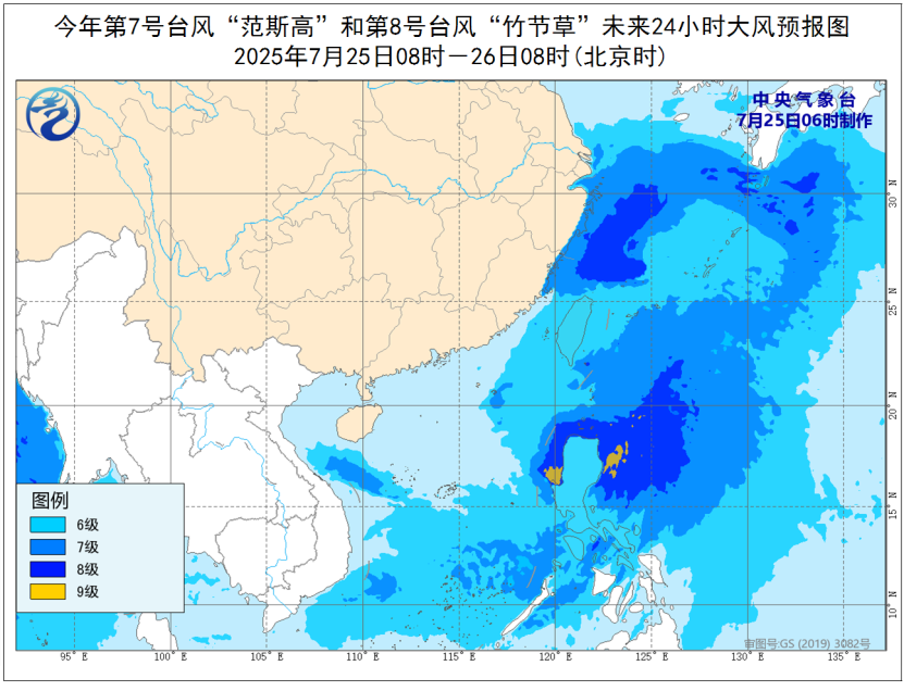 大风预报:7月25日08时至26日08时,受“范斯高”和“竹节草”的共同影响,东海大部、台湾海峡、台湾以东洋面、巴士海峡、南海东部和南部、杭州湾、江苏南部沿海、浙江沿海、福建沿海、台湾岛沿海将有6~8级、阵风9~10级大风。