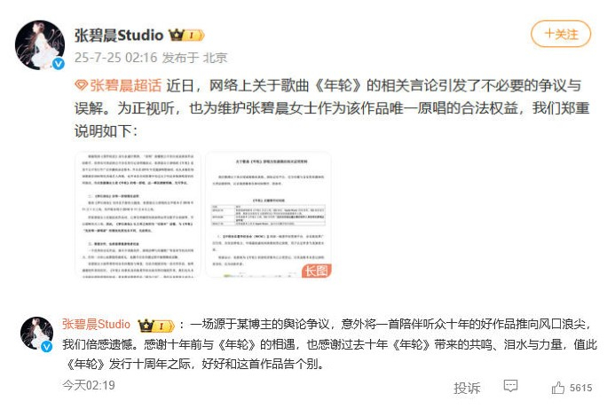 随后,张碧晨工作室发布相关说明称“张碧晨女士为该作品唯一原唱”,并在评论区留言称,“值此《年轮》发行十周年之际,好好和这首作品告个别。”