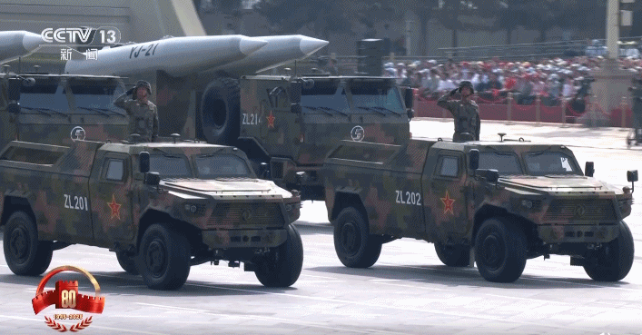 总台央视记者 王晓丹:高超声速导弹方队由多军种联合组成,在我身边的就是这次受阅的鹰击-21、东风-17、东风-26D导弹,都是高超声速导弹武器家族的重要力量,集中展现了我军高超声速精确打击能力。