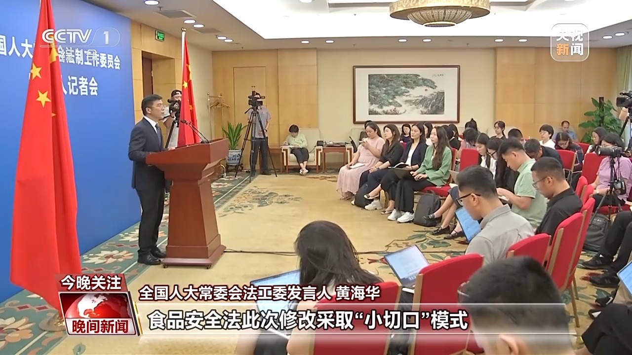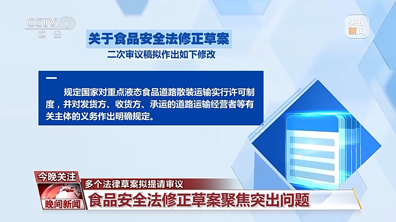 全国人大常委会法工委发言人 黄海华:食品安全法此次修改采取“小切口”模式,急用先行,聚焦突出问题。根据各方面意见,我们主要在加强重点液态食品道路散装运输监管、加大违法行为惩处力度等方面作了进一步修改完善。