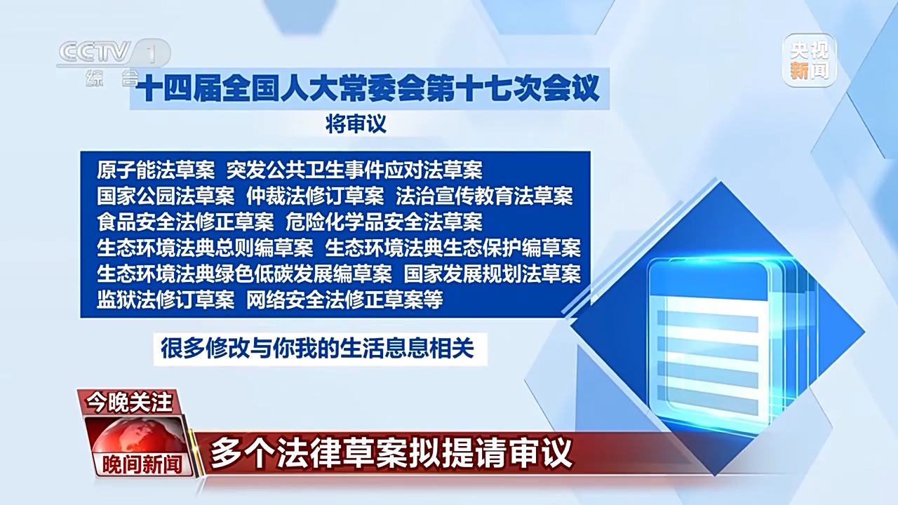 十四届全国人大常委会第十七次会议,将审议原子能法草案、突发公共卫生事件应对法草案、国家公园法草案、仲裁法修订草案、法治宣传教育法草案、食品安全法修正草案、危险化学品安全法草案、生态环境法典总则编草案、生态环境法典生态保护编草案、生态环境法典绿色低碳发展编草案、国家发展规划法草案、监狱法修订草案、网络安全法修正草案等。其中,很多修改与你我的生活息息相关。