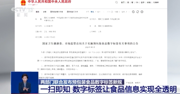 今后,这种情况要改变了,针对实体标签版面有限的痛点,国家卫生健康委、国家市场监督管理总局,今日(8日)联合发布《关于实施预包装食品数字标签有关事项的公告》,预包装食品,就是指预先包装或者制作在包装材料和容器中的食品,我们日常购买的除了生鲜等,绝大部分食品都是预包装食品。《公告》明确了预包装食品数字标签范围、使用和修改等应用要求,这标志着我国食品标签管理正式迈入数字化新阶段。