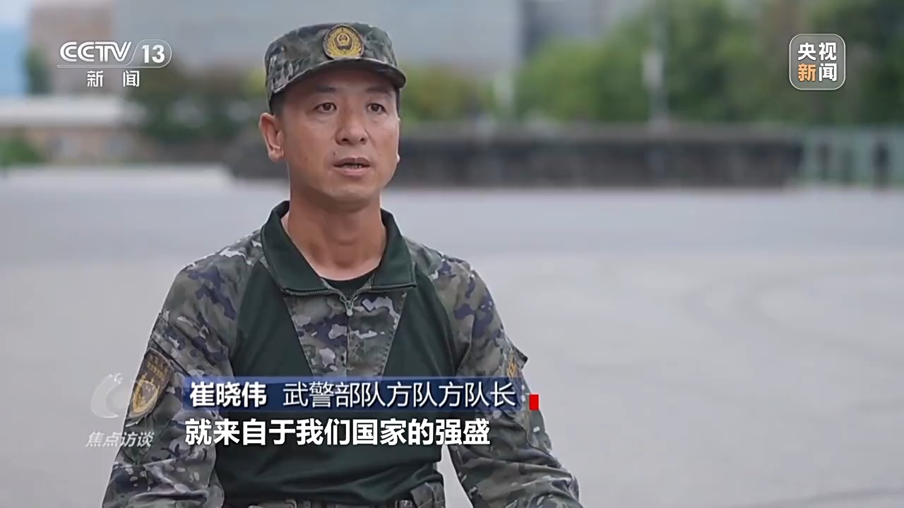 武警部队方队方队长 崔晓伟:这次我们多了更多的自信,这种精神的振奋、昂扬的精神状态,来自我们国家的强盛、人民军队的强大,来自发自内心的骄傲自豪、充满必胜的信念。