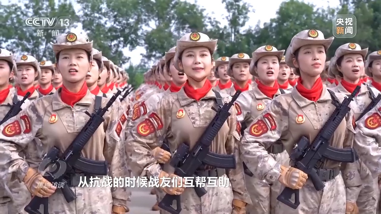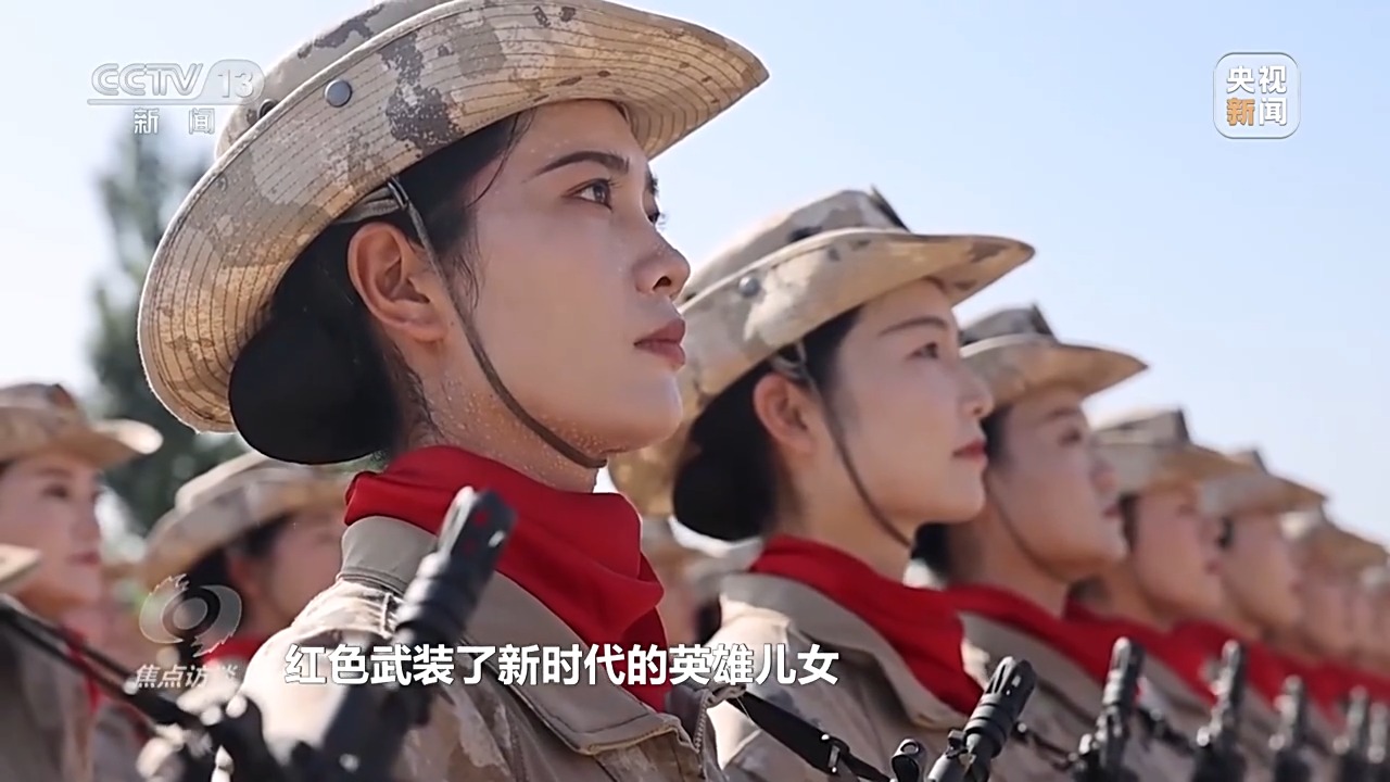 民兵方队领队 李依潼:今年跟以往不一样的是我们所参加的是以抗战胜利为主题的活动,所以我们没有像以往国庆阅兵着裙装。红色丝巾,因为我们所有的队员都是从全国的抗日根据地抽组而成的,红色武装了新时代的英雄儿女。