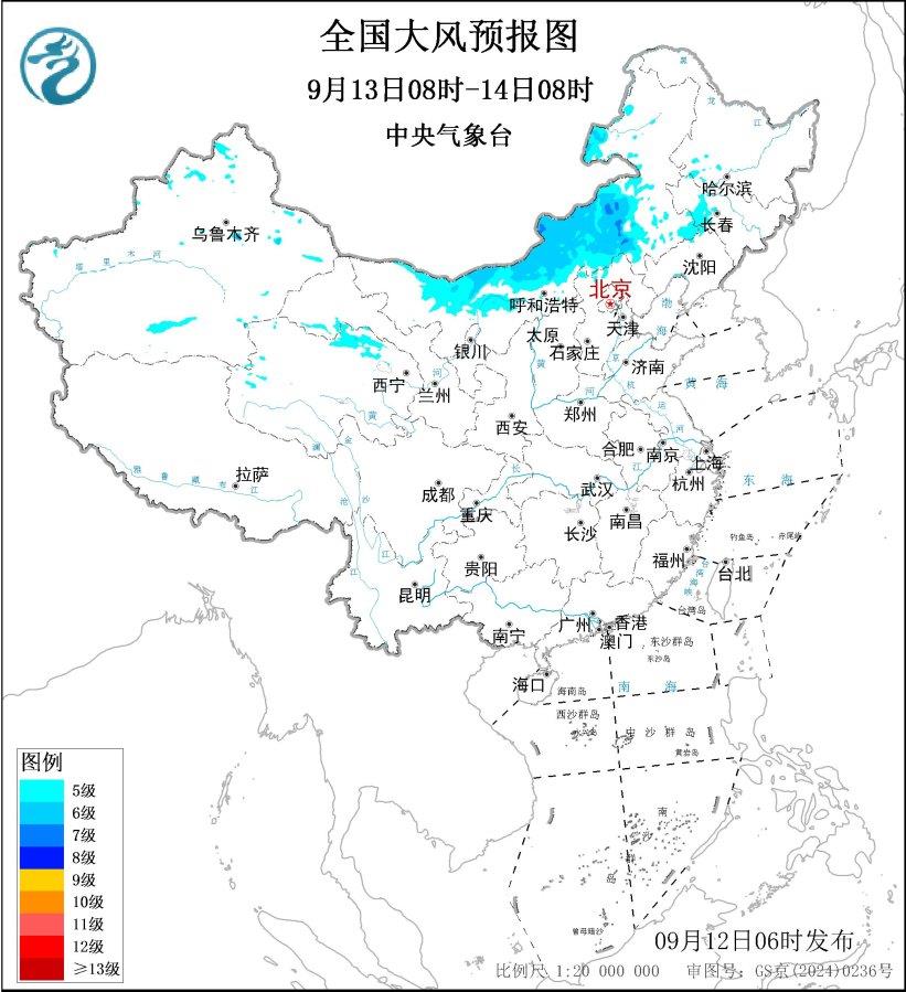 中央气象台9月12日6时继续发布大风蓝色预警:
