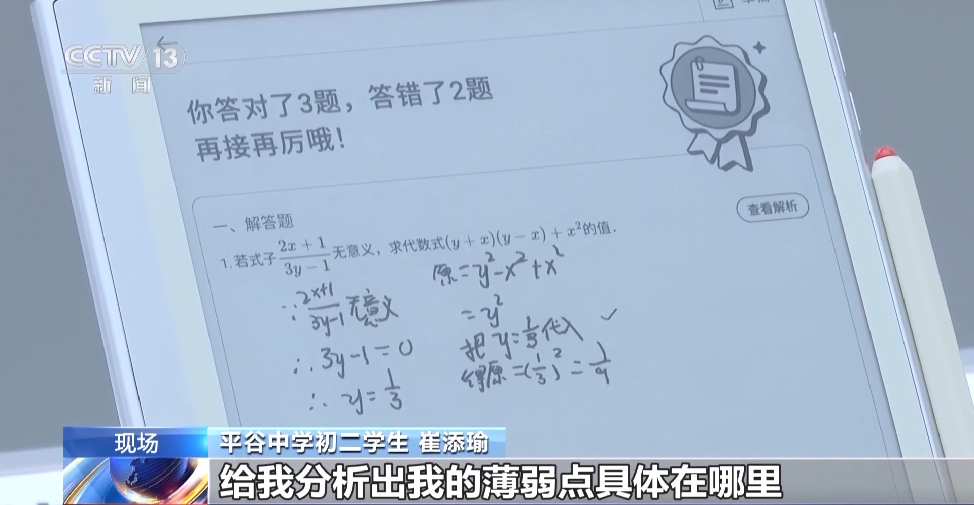 平谷中学初二数学教师 王爽:它有AI批改功能,我批作业的时间就能节省出来,帮助我快速拿到学生的学习情况分析,从而可以做出教学方面的调整。