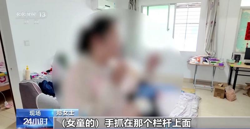 郑女士:我回来时整个人都腿软了,就把她紧紧抓着,小女孩手抓在栏杆上面,下面都已经悬空。