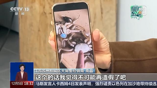 江苏苏州相城区大闸蟹经销商 高晶:第一眼看上去就感觉像AI制作的,运镜很奇怪。如果再细看,螃蟹脚出现了5只小腿,和正常的大闸蟹不一样。视频比例也裁切了,很明显就是为了去掉水印裁切的。所以我们让他再拍一段视频,用手指逐个去指一下,拨动一下,这个我觉得不可能再造假了。后来他真的发来了这样一段视频。