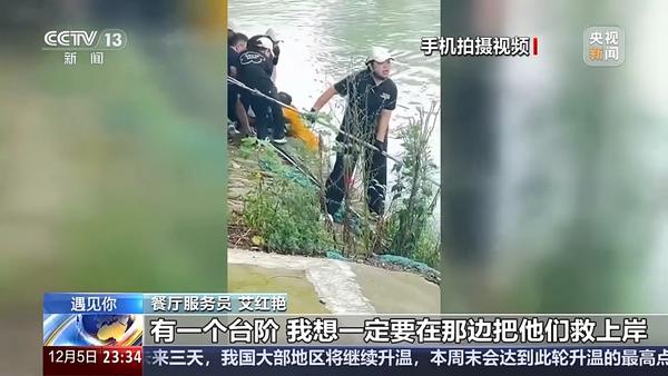 餐厅服务员 艾红艳:之前考察我去过下游,印象中下游有一块位置是没有护栏的,有一个台阶。我想一定要在那边把他们救上岸,因为我们的房梁比较高平时备了伸缩杆,刚好就起到作用了。
