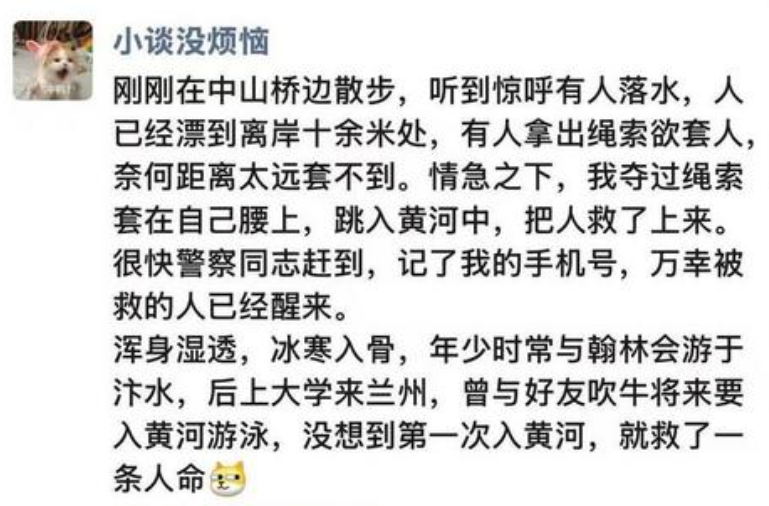“上大学来兰州,曾与好友吹牛将来要入黄河游泳,没想到第一次入黄河是救了一条人命”,最近,兰州大学博士生谈磊的朋友圈在网上火了!