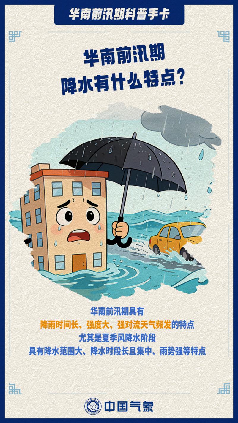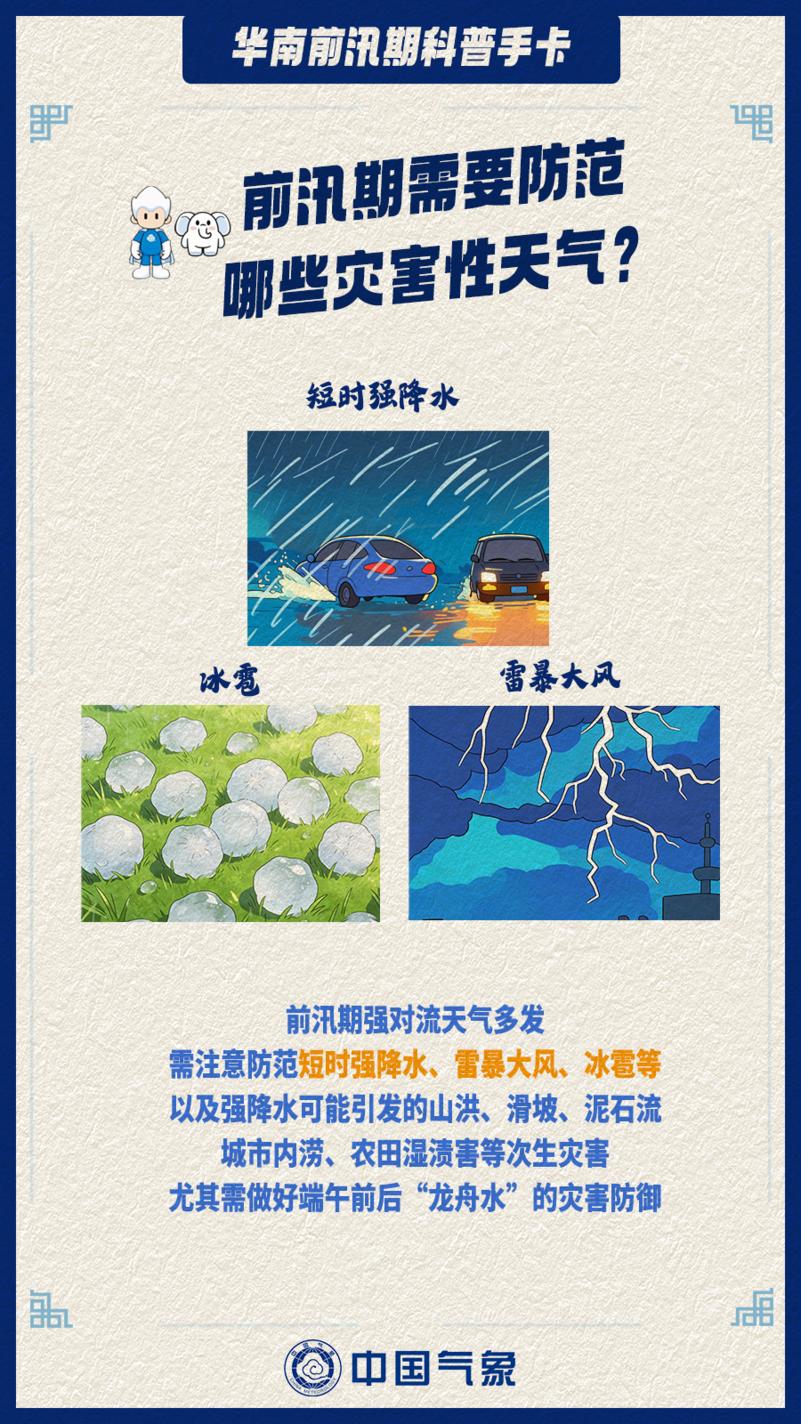 华南前汛期具有降水时间长、强度大、强对流天气频发的特点,需注意防范短时强降水、雷暴大风、冰雹以及强降水可能引发的山洪、滑坡、泥石流、城市暴雨积涝、农田湿渍害等次生灾害,尤其需做好端午前后“龙舟水”的防御。