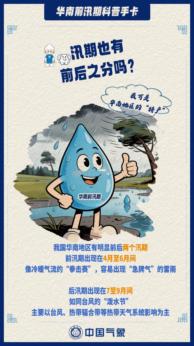 我国仅华南地区有前后两个汛期,前汛期是指华南地区在4月至6月受冷暖空气和季风影响出现的多雨时期,后汛期则出现在7月至9月,以台风、热带辐合带等热带天气系统影响为主。