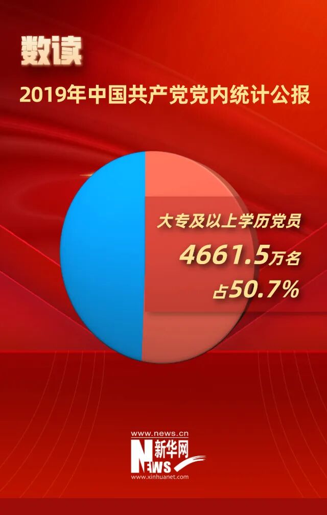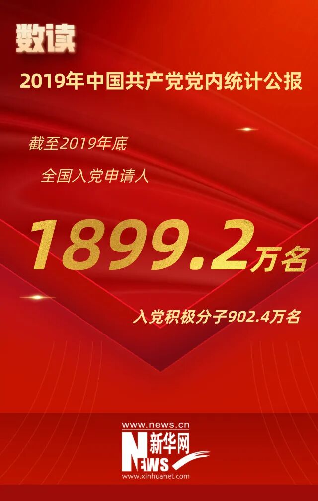 党员9191.4万名 基层党组织468.1万个 中国共产党党员队伍继续发展壮大 基层党组织政治功能和组织力进一步增强 中央组织部最新党内统计数据显示,截至2019年底,中国共产党党员总数为9191.4万名,比上年净增132.0万名。党的基层组织468.1万个,比上年净增7.1万个。中国共产党的凝聚力和战斗力不断增强,党的组织体系更加健全,党的执政根基进一步夯实。 党员数量平稳增长。全国党员总量增幅为1.5%,比上年提高0.3个百分点。全年发展党员234.4万名,比上年增加28.9万名,产业工人、青年农民、高知识群体和非公有制经济组织、社会组织中发展党员数量增加明显。 党员队伍结构持续优化。女党员2559.9万名,占27.9%,比上年提高0.7个百分点;少数民族党员680.3万名,占7.4%,比上年提高0.1个百分点。40岁以下党员超过总数的1/3,队伍年龄结构有所改善。工人和农民仍占主体,占比为34.8%。党员队伍文化程度继续提高,大专及以上学历党员超过半数,达4661.5万名。 党员教育管理不断加强。各级党组织深入开展“不忘初心、牢记使命”主题教育,加大党员教育培训力度,全年培训党员数量比上年增加24.3%,99.7%的乡镇直接组织开展农村党员集中培训。党的组织生活更加严格规范,3201个地方党委领导班子召开民主生活会,400.7万个党支部召开专题组织生活会开展民主评议党员,任期届满的111.5万个基层党组织按期完成换届。 基层党组织建设不断加强。全国共设立基层党委24.9万个、总支部30.5万个、支部412.7万个,分别比上年增加1.0万个、0.6万个、5.5万个,组织设置更加科学规范。农村基层党组织在脱贫攻坚中战斗堡垒作用增强,选派第一书记24.0万名,实现建档立卡贫困村和党组织软弱涣散村全覆盖。城市基层党建创新发展,各领域党组织互联互动,实行与驻区单位党建联建共建的街道、社区有8123个、6.5万个,占比分别提高3.4、2.6个百分点。基层基础保障力度加大,95.8%的社区落实服务群众专项经费,提高2.7个百分点;全年新建或改扩建村级组织活动场所5.0万个。国有企业、机关、高校、公立医院和非公有制企业、社会组织党建工作得到新的提升。