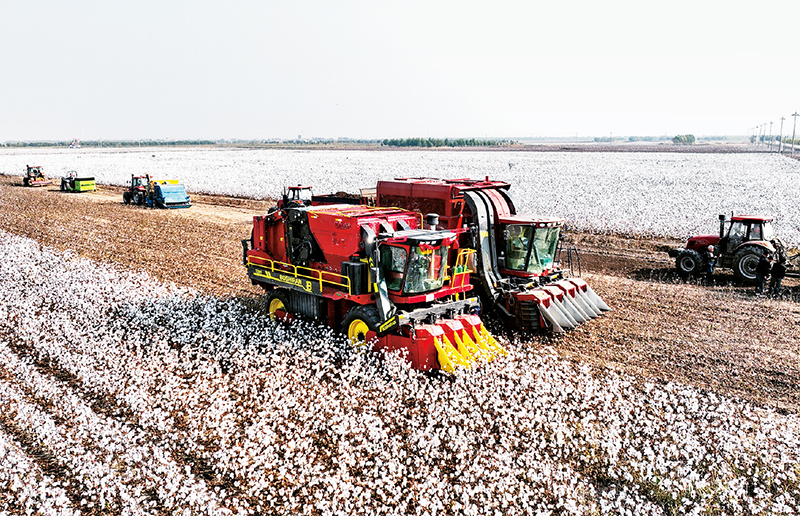 山东省滨州市无棣县地处黄河三角洲棉区中心,可利用盐碱耕地资源丰富,植棉历史悠久,常年植棉面积稳定在10万亩左右。图为2023年10月22日,棉农驾驶机械在无棣县西小王镇国家级棉花生产基地核心示范区内进行采棉作业(无人机照片)。 新华社记者 朱峥/摄