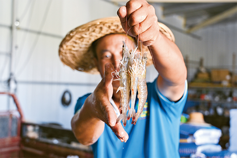 地处黄河岸边的内蒙古乌海市海南区巴音陶亥镇,因地制宜利用盐碱地开展农业养殖,不仅提高了盐碱地的利用率,也带动当地村民致富。图为养殖园区工作人员展示养殖的对虾。 新华社记者 刘磊/摄