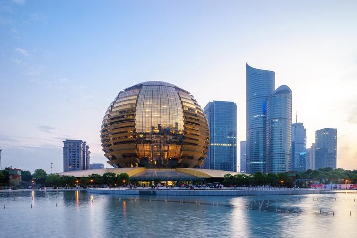 钱江新城是杭州经济发展的新地标。杭州国际会议中心位于钱江新城核心区,人们喜欢称它为“大金球”,不仅是因为它像一颗巨大的“巧克力”,更是因为每每看到它,杭州人就会心生自豪,这里曾迎来许多国际级的会议。杭州国际会议中心和杭州大剧院这一对姊妹建筑交相辉映。在波涛汹涌的钱塘江畔勾勒出“日月同辉”的雄浑景象,成为杭州独一无二的城市符号和崭新地标。