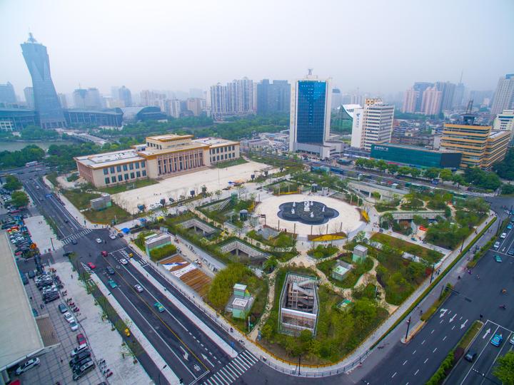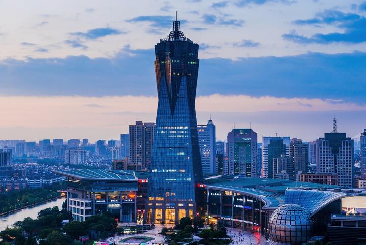 与武林广场隔运河相望的西湖文化广场,以杭州特有的西湖文化、运河文化和古塔文化为建筑背景,是浙江省的文化中心和杭州市的“城市客厅”。浙江环球中心,170米绝对海拔,41层摩天高度,这座曾是杭州市中心第一高楼的建筑,如今依然是杭州市地标性建筑之一。