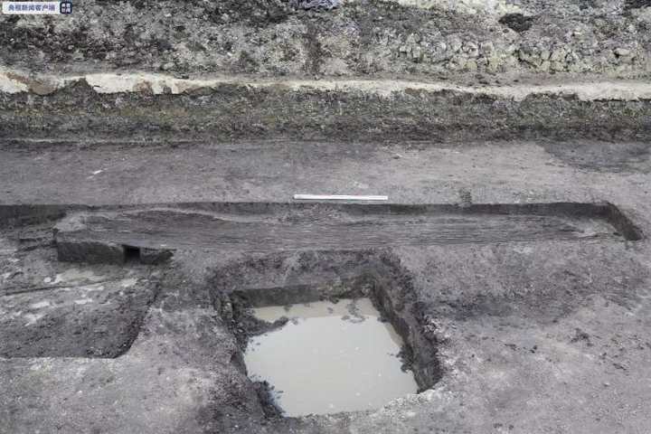 根据这段弧形木板的形态来看,其应是一残独木舟。因水稻田比较泥泞,往往在道路中铺垫数量不等的木头作为垫木,考古队认为这一残独木舟废弃后成为了道路的垫木。同层水稻田经碳十四测年树轮校正后在公元前2900—前2700年。同时,这一解剖区域发现了一条更早阶段的用竹子铺垫的道路。