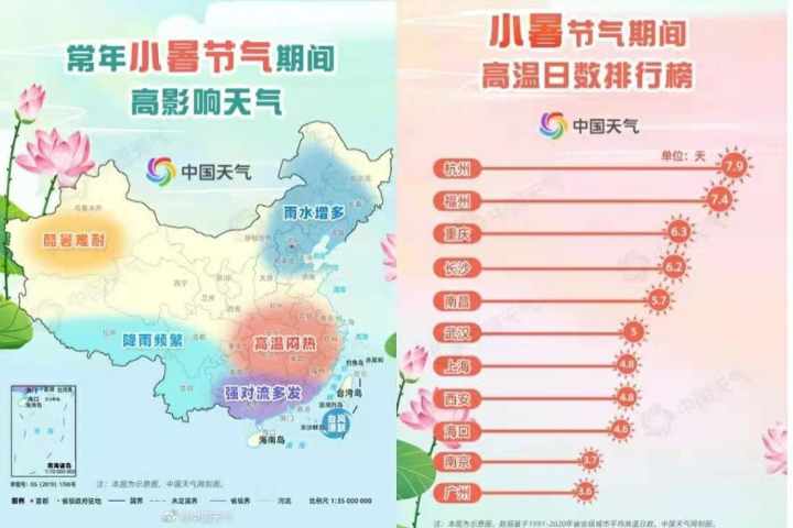 热浪滚滚,在全国省会级城市的PK中,谁是小暑“高温王”呢?据中国天气网统计,1991-2020平均数据中,杭州以7.9天摘得小暑期间高温日数排行榜榜首。