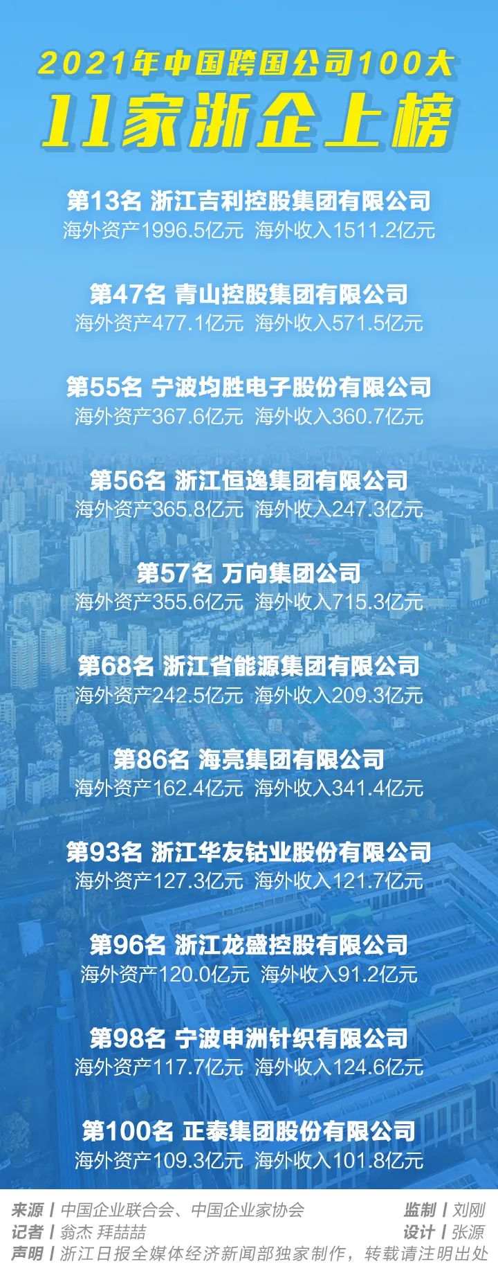翻看“2021中国跨国公司100大”榜单,涌金君发现:10家上榜的浙江民营企业几乎都是在过去十几年里完成关键性海外投资,成长为今天的跨国巨头。
