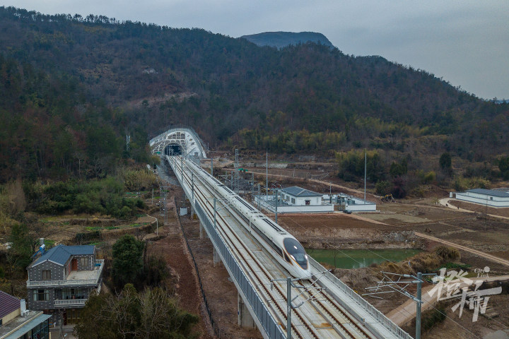 这条位于浙江省中东部的高铁,行经丘陵、盆地等多种地貌单元,全线建有正线桥梁87座、隧道56座,桥梁隧道占比高达89%。