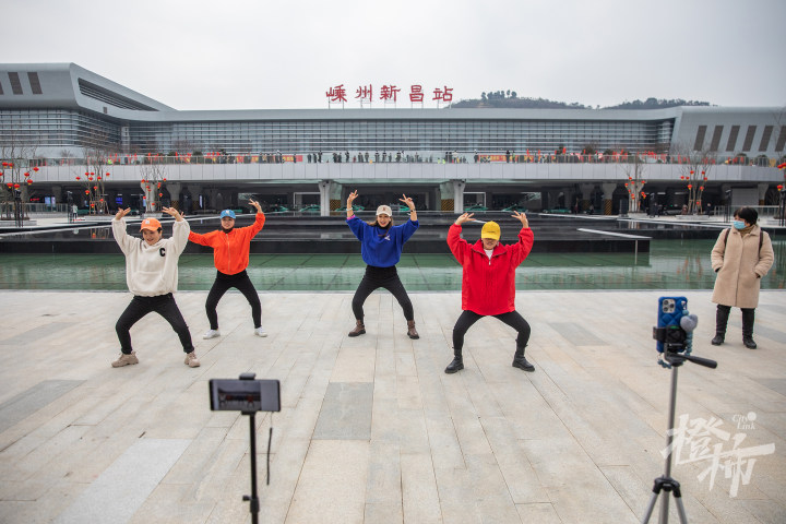 几位市民在嵊州新昌站前广场拍短视频打卡,还跳起了“螃蟹舞”。