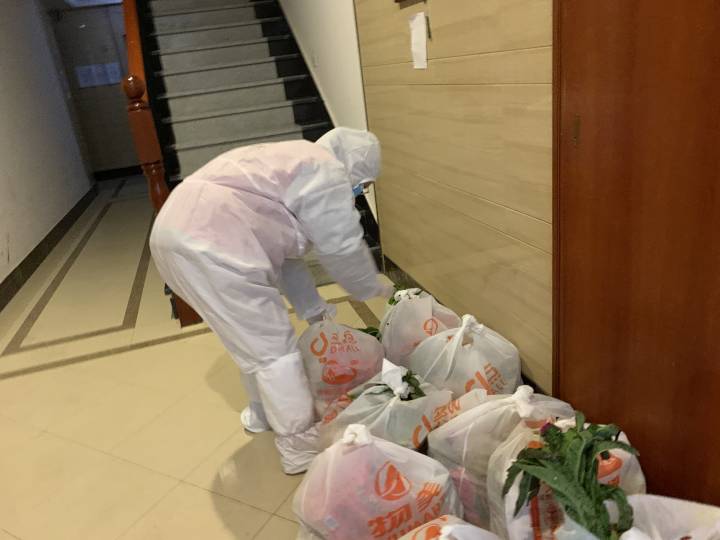 虽然小区有送来的政府物资,但是很多居民有“想吃车厘子,想吃哈密瓜”的个性化需求,叫朋友送来想吃的东西到小区门口。