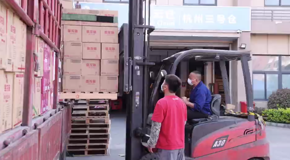 在杭州传化公路港,工人们正在一万多平方米的仓库里进行装卸作业。