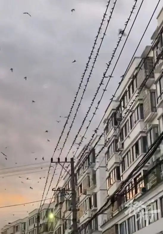落下之后,站在村民屋前的电线上,密密麻麻排成排,一直到第二天一早才离开村子,也不知飞往何处,但傍晚时分又会回来。