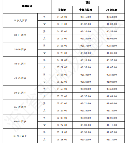 年龄组别分:29周岁以下组、30-34周岁组、35-39周岁组、40-44周岁组、45-49周岁组、50-54周岁组、55-59周岁组、60-64周岁组、65周岁以上组,共9个级别。