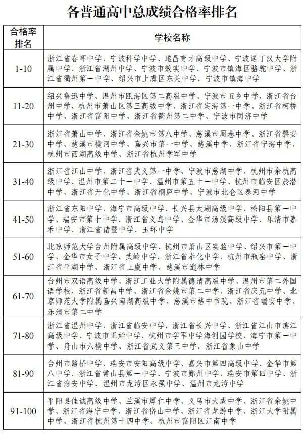 2021学年,各普通高中总成绩合格率排名前10位的是:春晖中学、宁波科学中学、遂昌育才高级中学、宁波诺丁汉大学附属中学、湖州中学、效实中学、镇海区骆驼中学、衢州一中、上虞东关中学、镇海中学。其中,宁波的高中占了五席,表现抢眼。