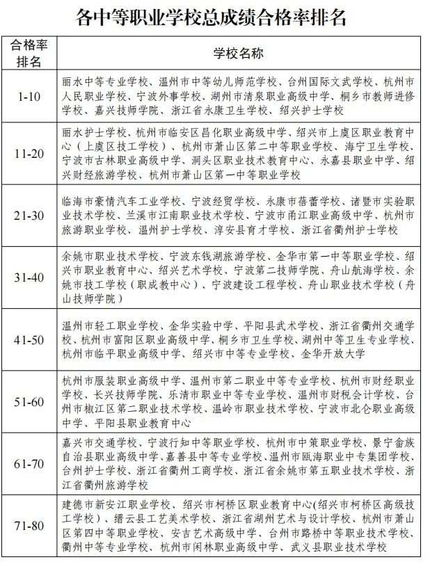 浙江新闻客户端记者对比2020年和2019年的排名发现,2020年全省总成绩合格率排名前十名分别是:杭州外国语学校、瓯海中学、春晖中学、温州第二高级中学、温州中学、嘉兴一中、慈溪三山高级中学、嘉兴秀洲中学、萧山中学、义乌中学。