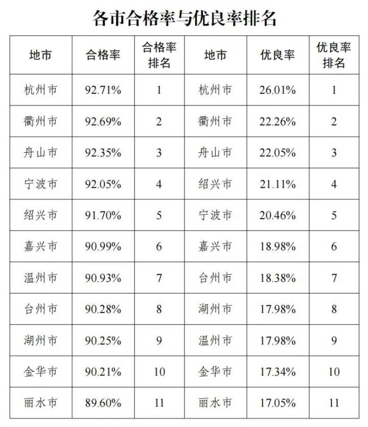 在各地市总成绩合格率和优良率排名中,杭州市都位列第一,数据很抢眼。