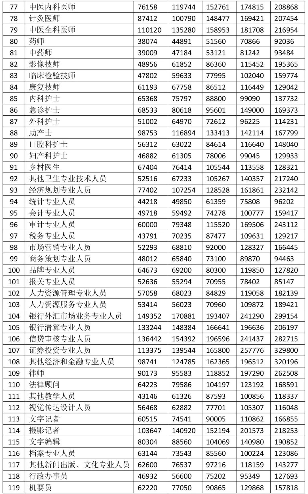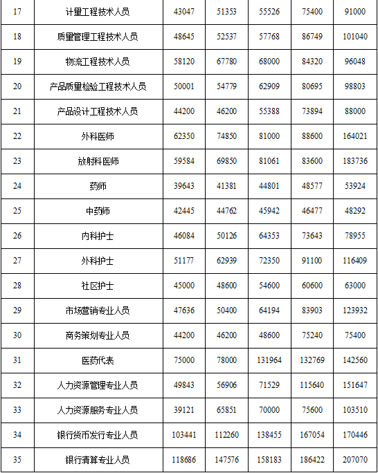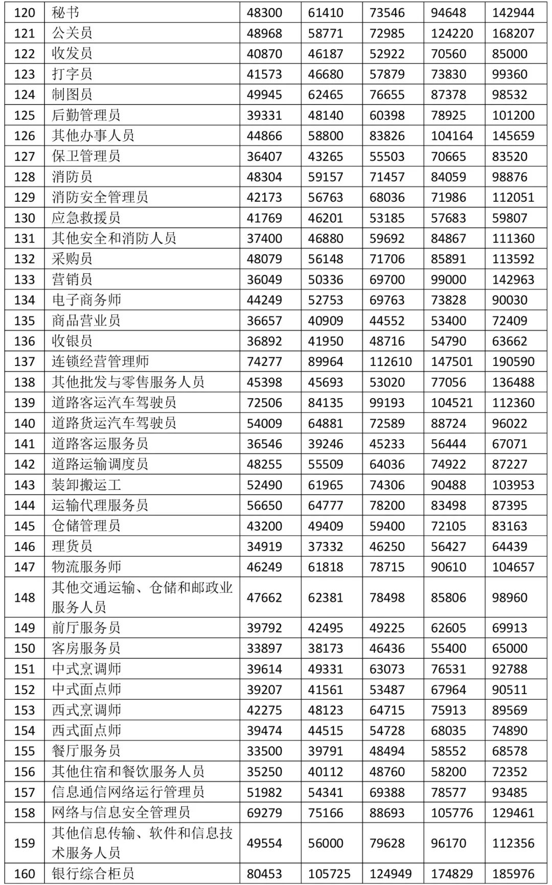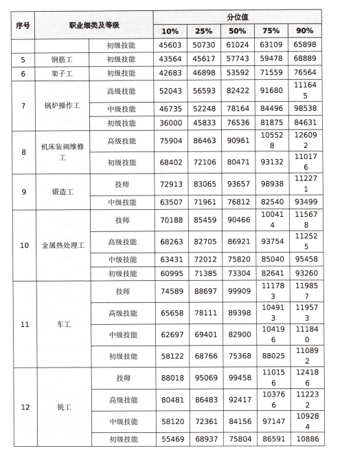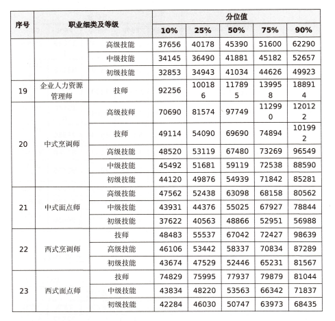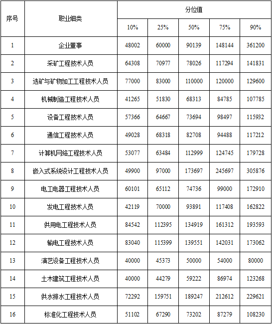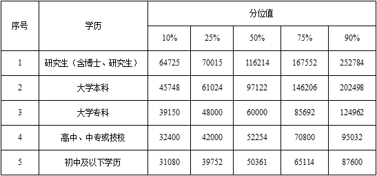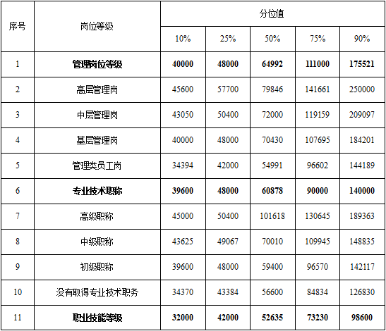 本次工资价位分别公布了10分位值、25分位值、50分位值、75分位值、90分位值,适合于不同企业的需求。分位值工资水平是指将所有调查的从业人员工资报酬数据按照从业人员规模加权处理后,按由低到高排序,处在某个分位上的工资水平。