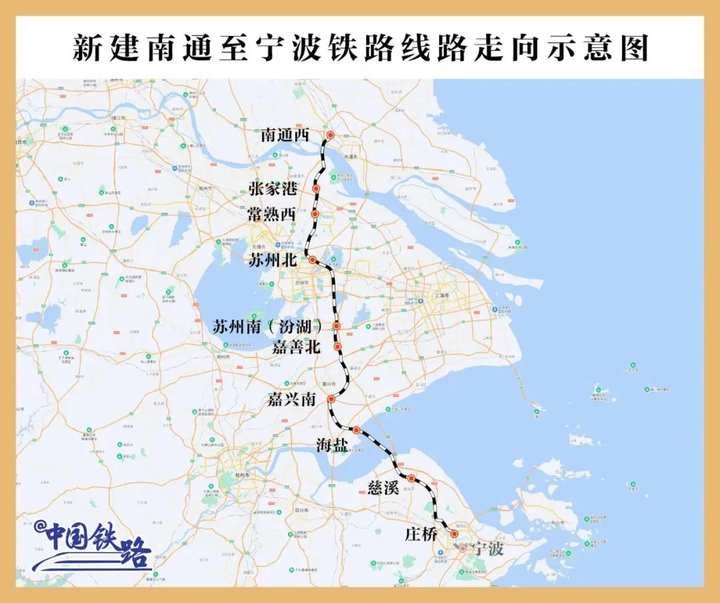 全线设南通西、张家港、常熟西、苏州北、苏州南、嘉善北、嘉兴南、海盐、慈溪、庄桥10座车站,其中常熟西、苏州南、嘉善北、海盐、慈溪5座车站为新建车站,其他为既有车站。