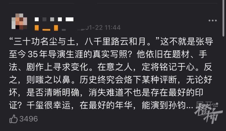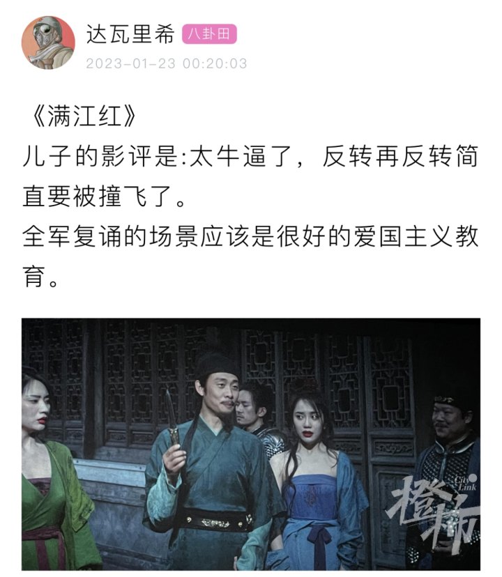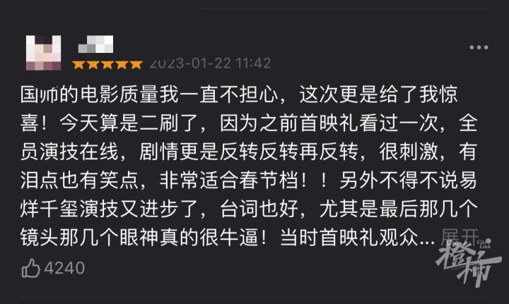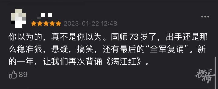 而就在大年初三这天,橙友“散步的云”一家三口都去看了《满江红》,看到结尾处,“雷佳音诵《满江红》的时候,泪流满面,太悲壮了。又搞笑又感动,又烧脑,各种反转,是真的好看,五星推荐。”