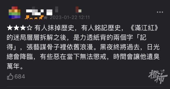 橙友“吃可爱多长大的橙四”看完片大赞道,“全片没有岳飞,将军身死,但精忠报国的精神不灭。贩夫走卒,纤弱如女子,也有舍生取义之勇。中国人的家国情怀是一种极致浪漫。”