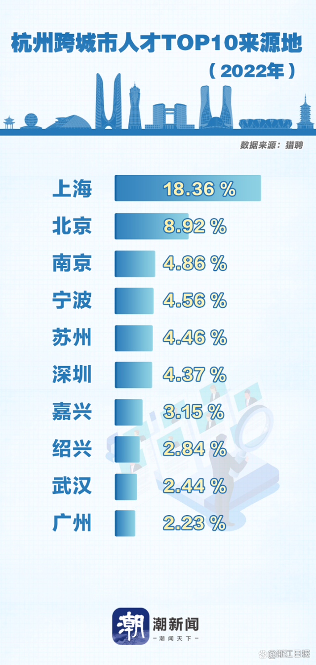 根据猎聘大数据研究院提供的《2022年杭州流入人才画像》(以下简称《人才画像》)数据,近一年来跨城市流入杭州的人才来源城市TOP10中,上海和北京占比最高,分别为18.36%、8.92%。